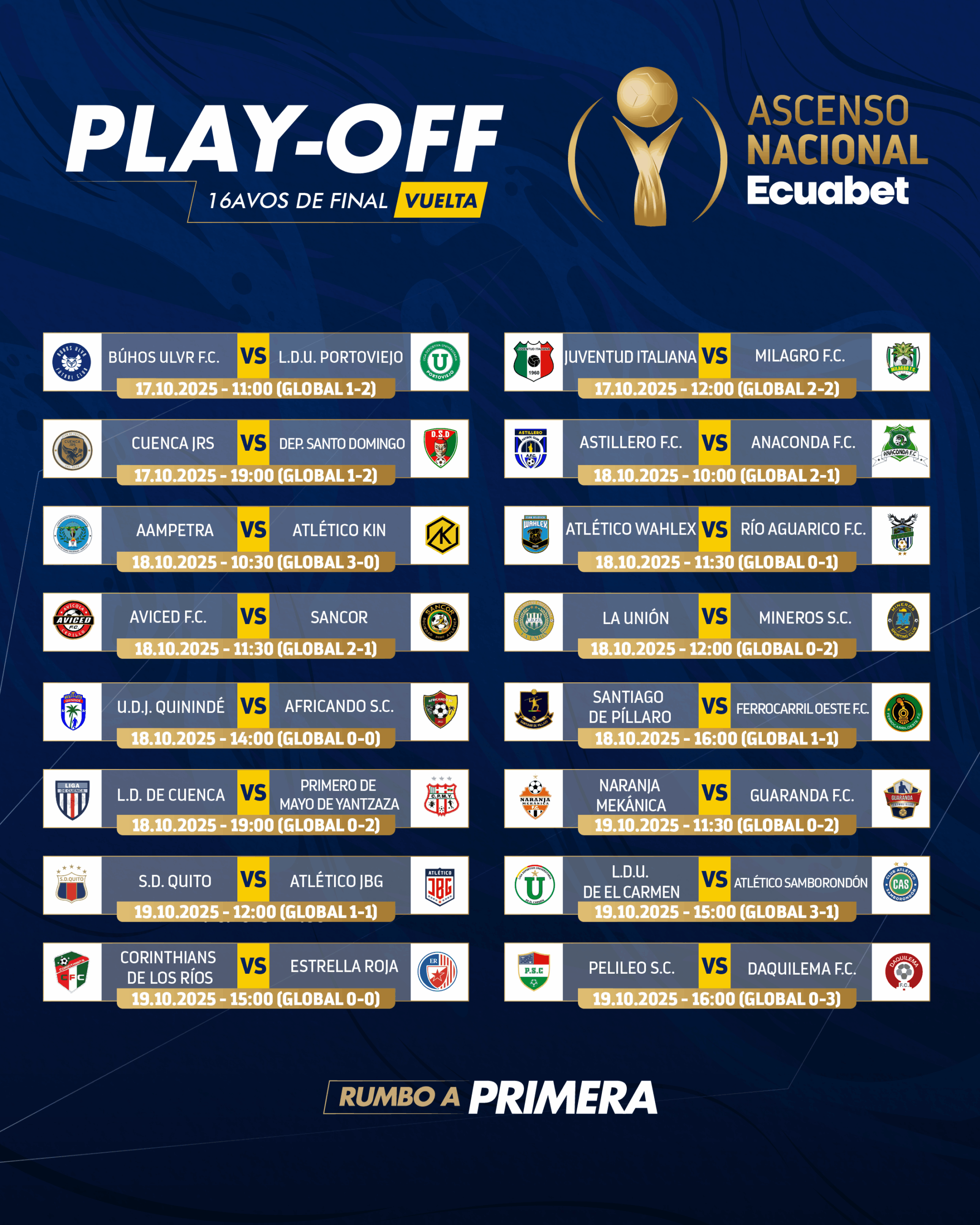 Este fin de semana se jugarán los partidos de vuelta de los dieciseisavos de final del Ascenso Nacional Ecuabet 2025 y se definirán los clasificados a octavos de final de esta competición organizada por la Federación Ecuatoriana de Fútbol que otorga dos cupos a la Primera Categoría Serie B.