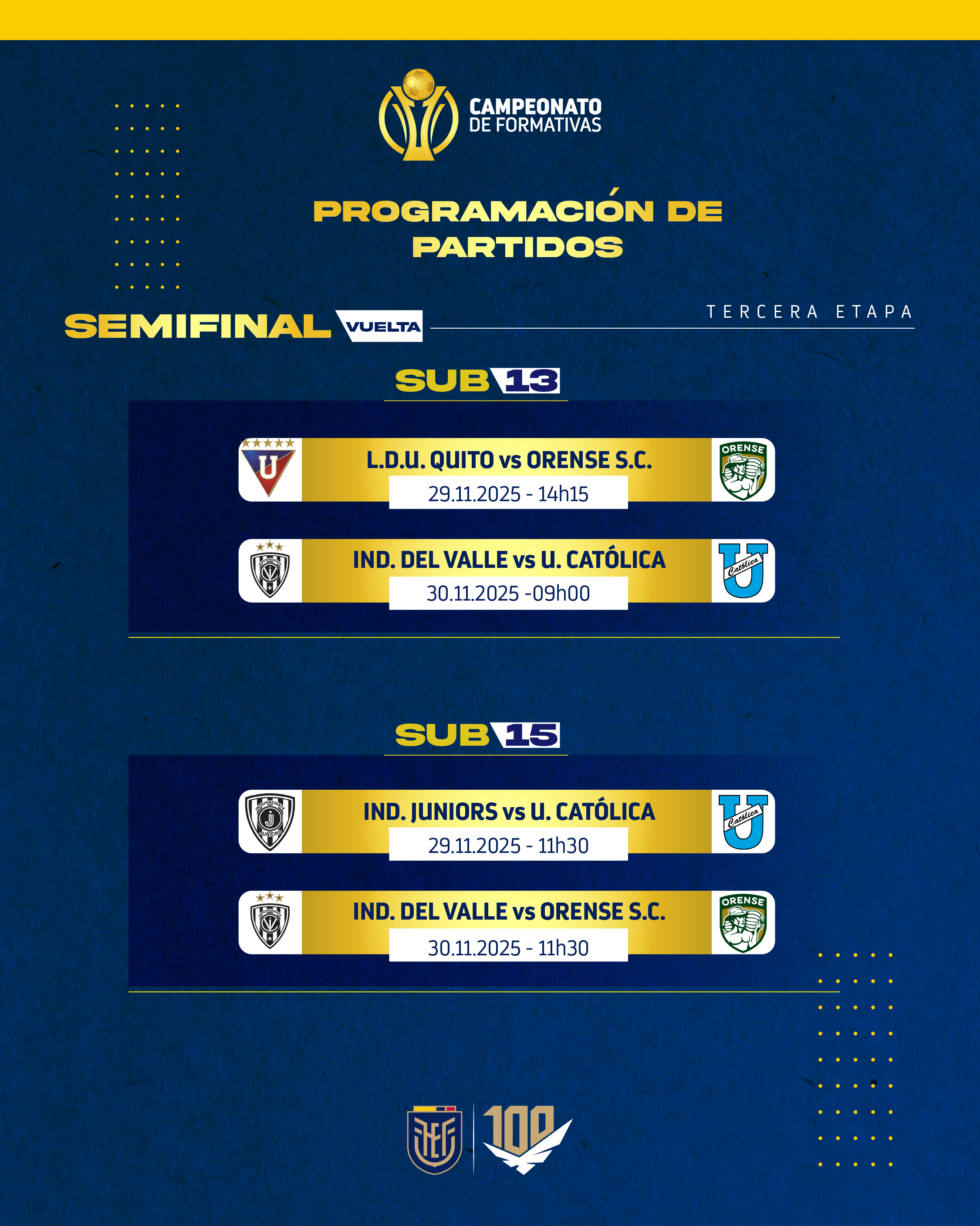 En la categoría Sub 15, Independiente Juniors y Universidad Católica jugarán el sábado a las 11h30 en la cancha #5 de la Ciudad Deportiva IDV; por la otra llave de este mismo grupo, Independiente del Valle Y Orense Sporting club disputarán el boleto a la final desde las 11h30 en el Chubb Arena,