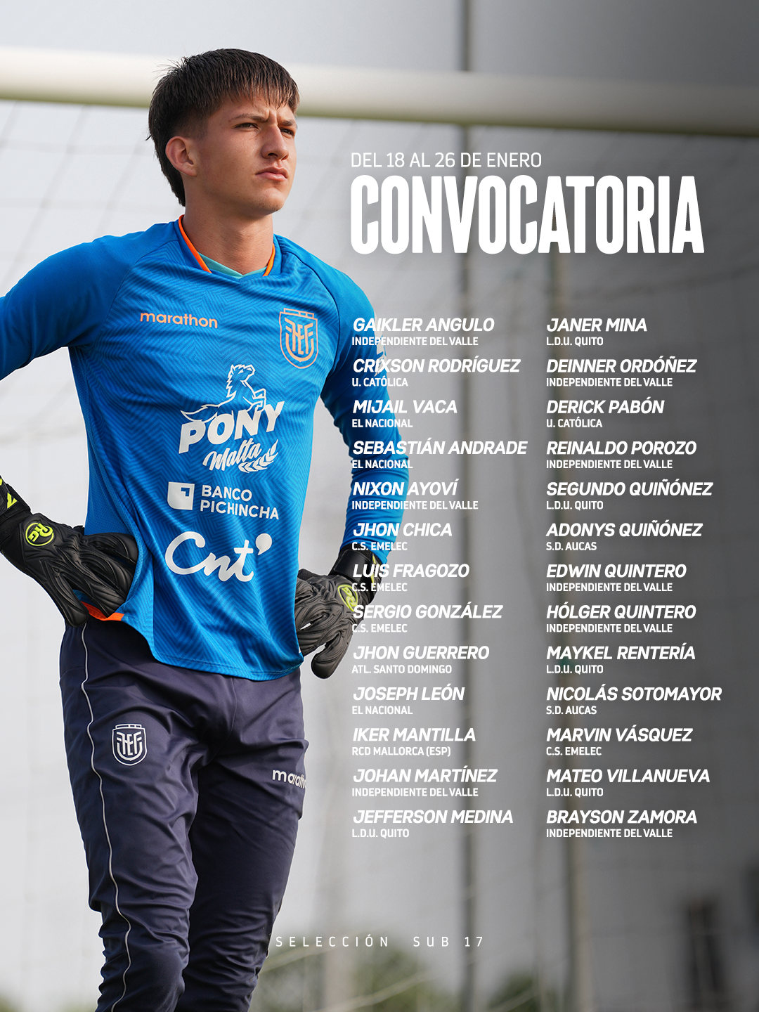 Lunes 19 de enero.- La Selección Ecuatoriana Sub 17 inició su primer microciclo de trabajo del 2026 en la Casa de la Selección, Quito, como parte de la planificación anual de la categoría y del camino preparatorio hacia el CONMEBOL Sudamericano Sub 17, que está previsto para disputarse en abril de 2026.