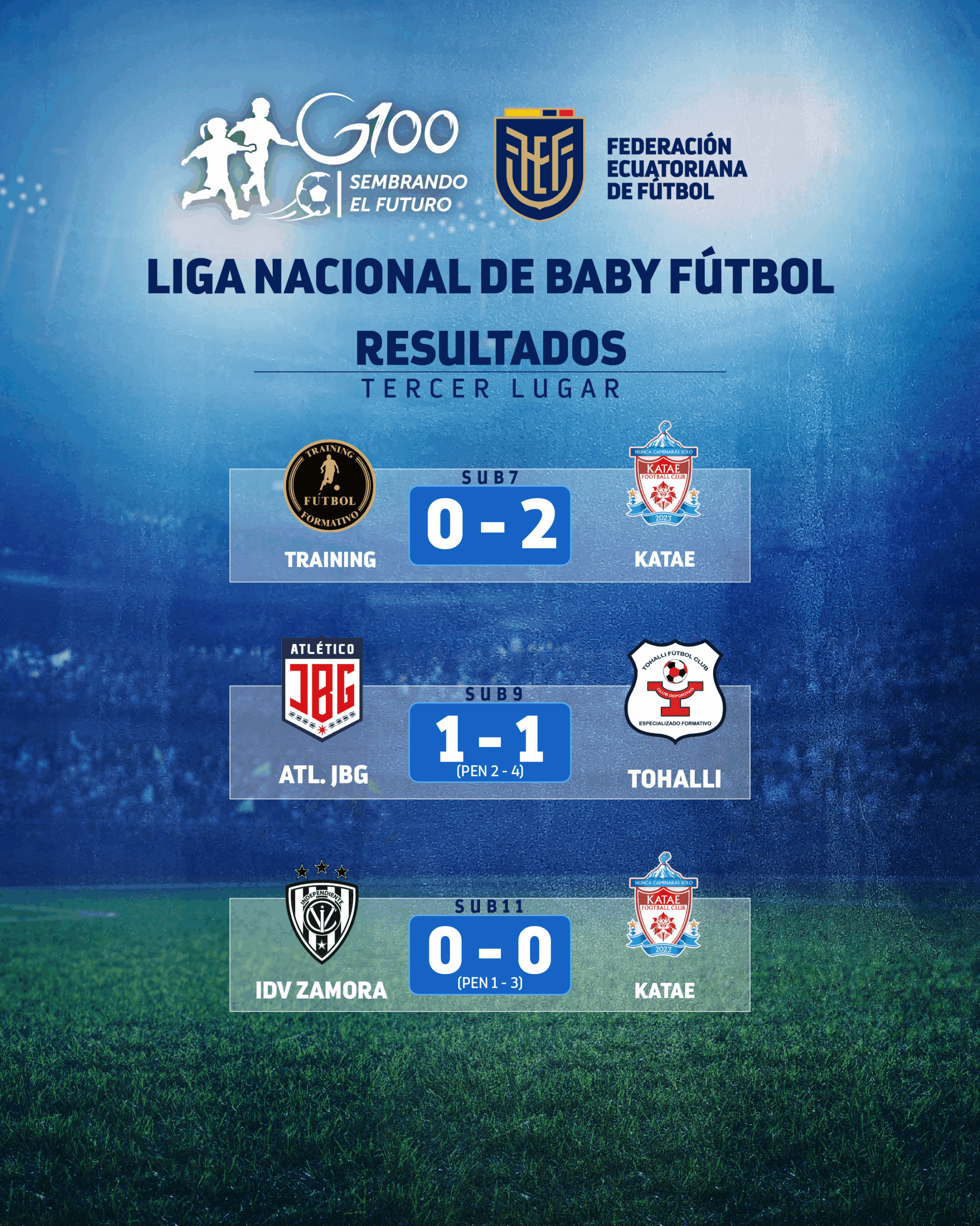 Los campeones reflejan la diversidad y alcance que tiene la Liga Nacional del Baby Fútbol en el territorio ecuatoriano: Liga Palanda, es un equipo proveniente de Zamora Chinchipe; Ciro Castillo, de Napo; y Tohallí FC, de Manabí.
