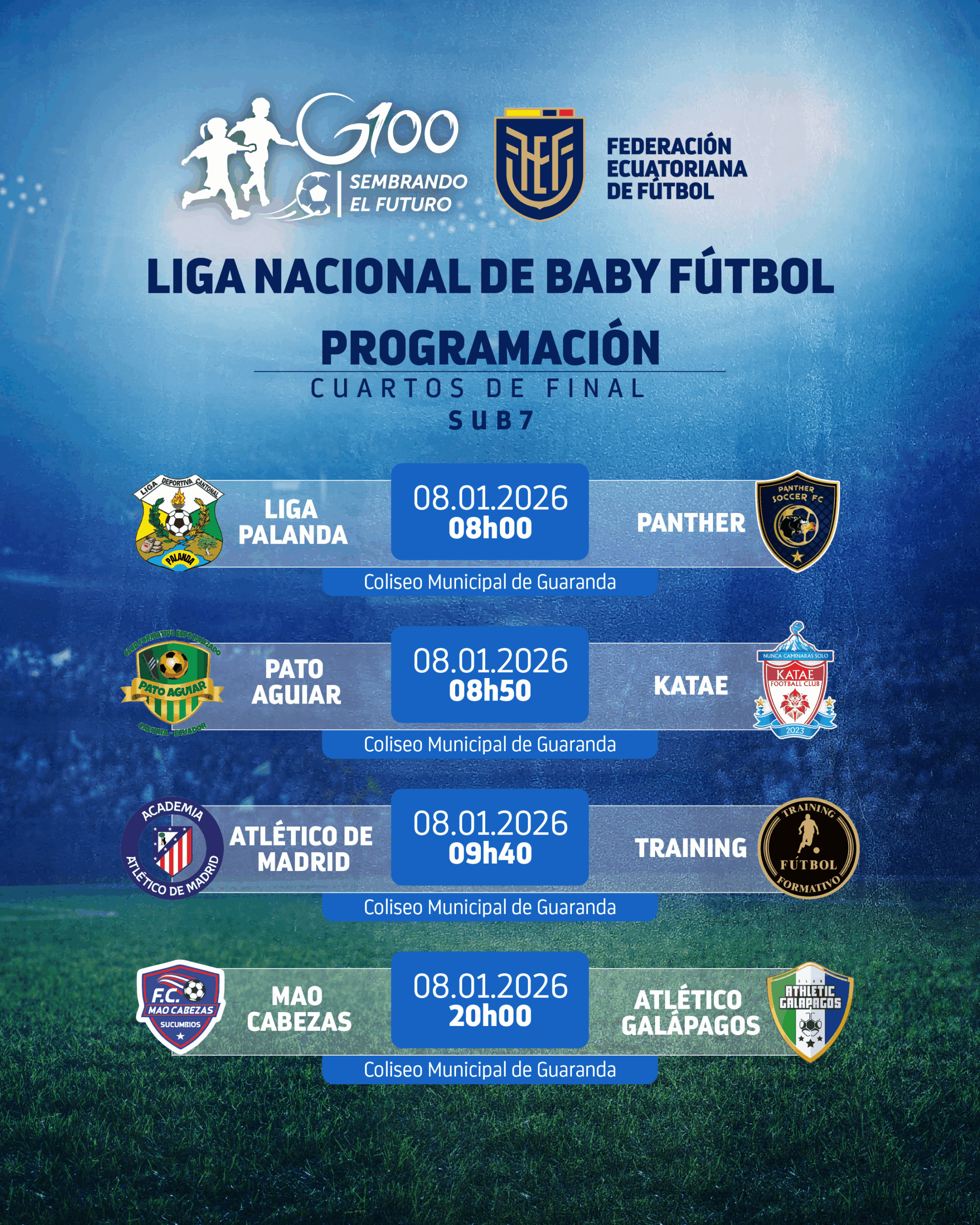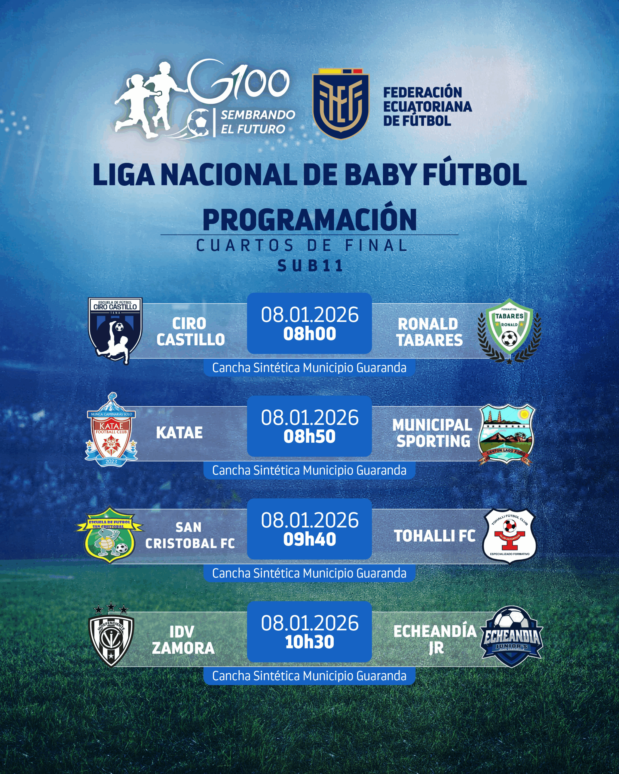 Los cuartos de final se jugarán el jueves 8 de enero en dos escenarios deportivos: el Coliseo Municipal y la Cancha Sintética del Municipio de Guaranda.