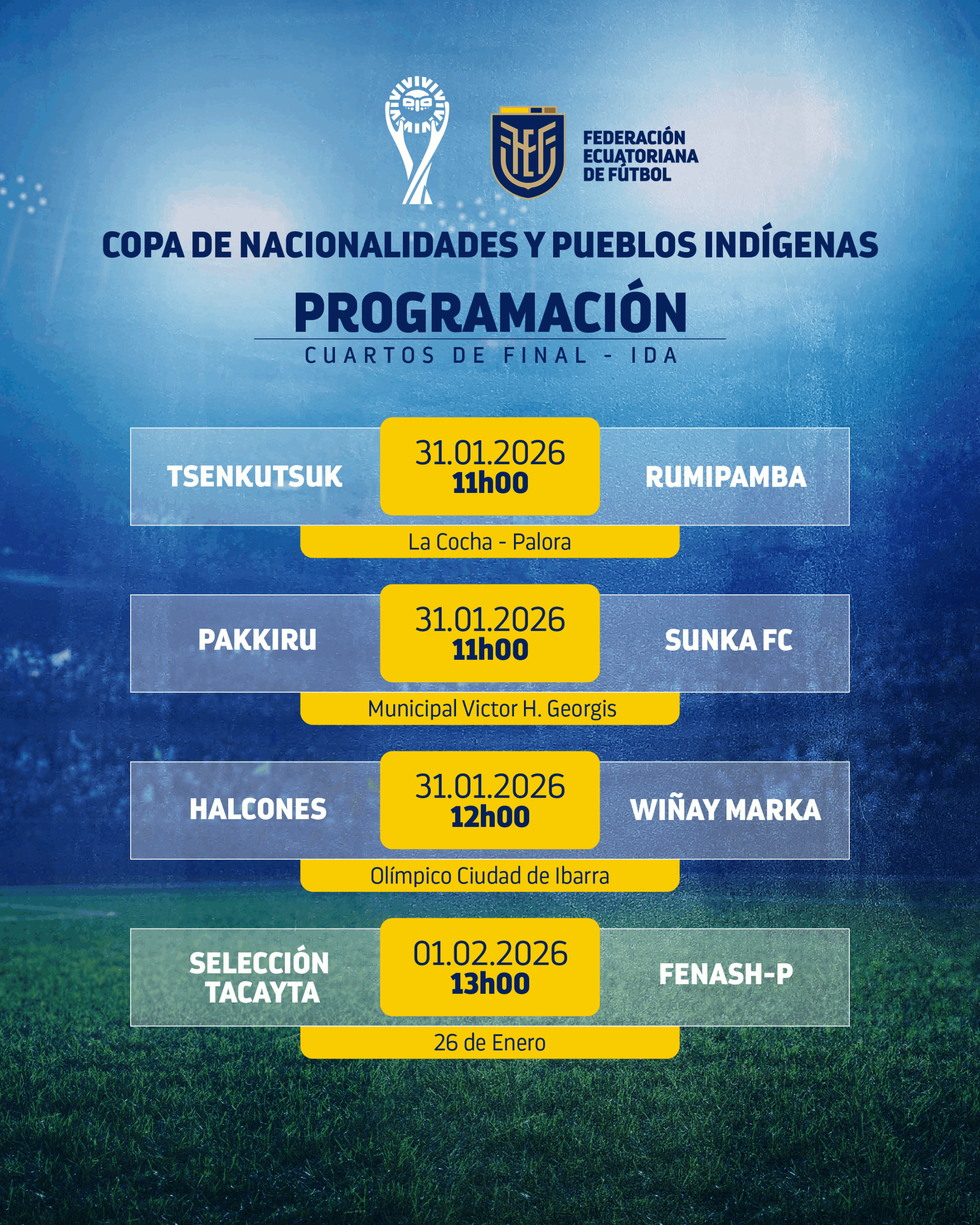 La programación de los partidos de ida de los cuartos de final de la Copa de Nacionalidades y Pueblos Indígenas del Ecuador se jugará entre el sábado 31 de enero y domingo 1 de febrero.