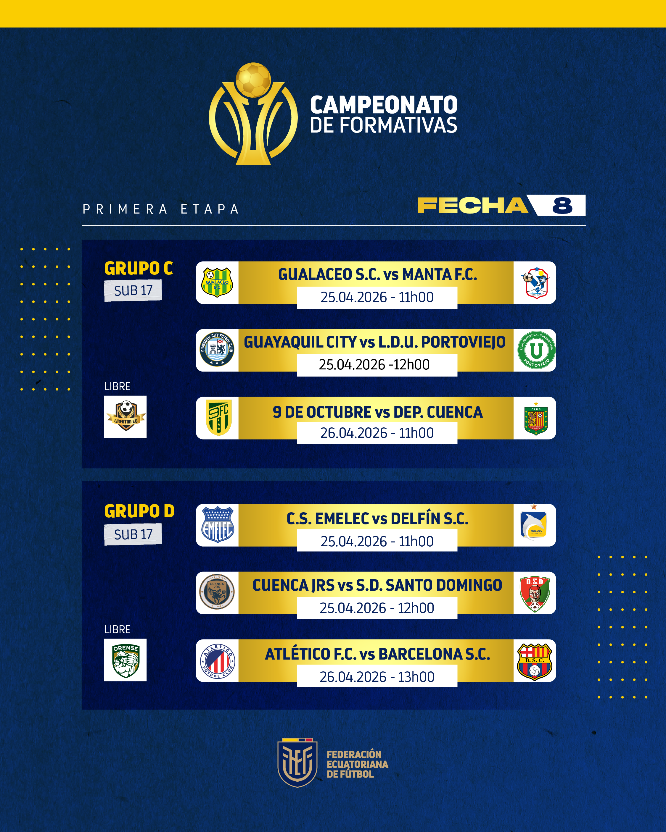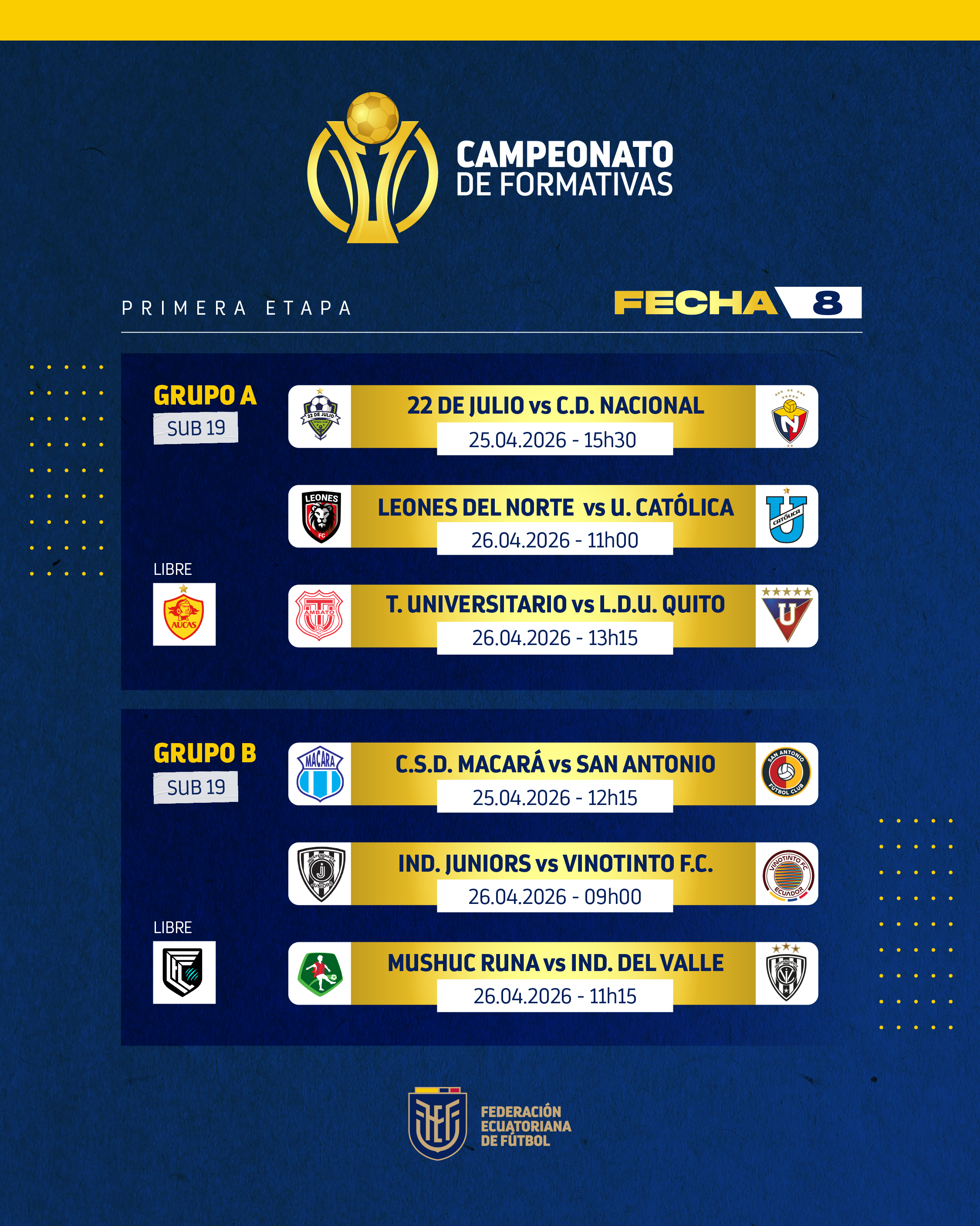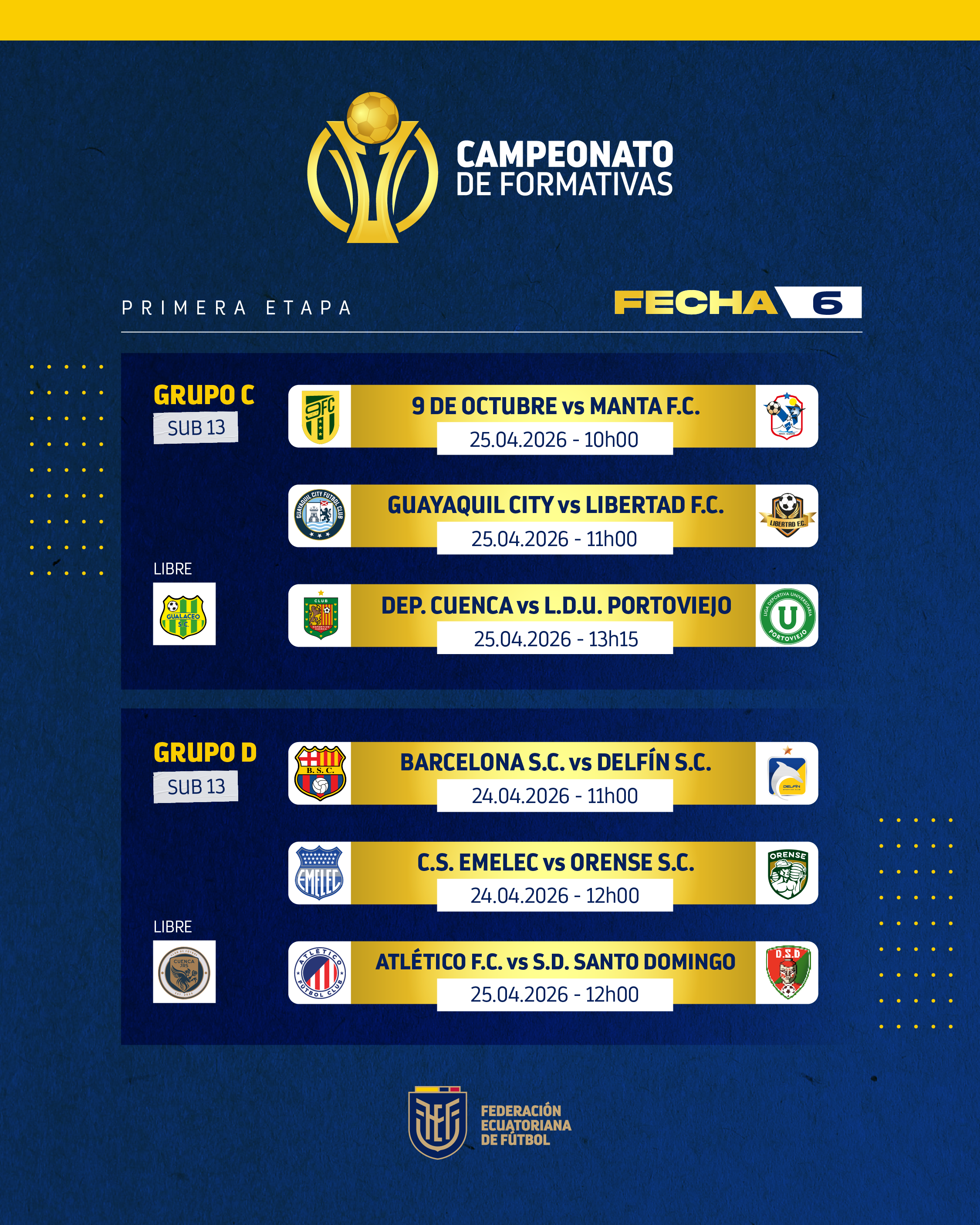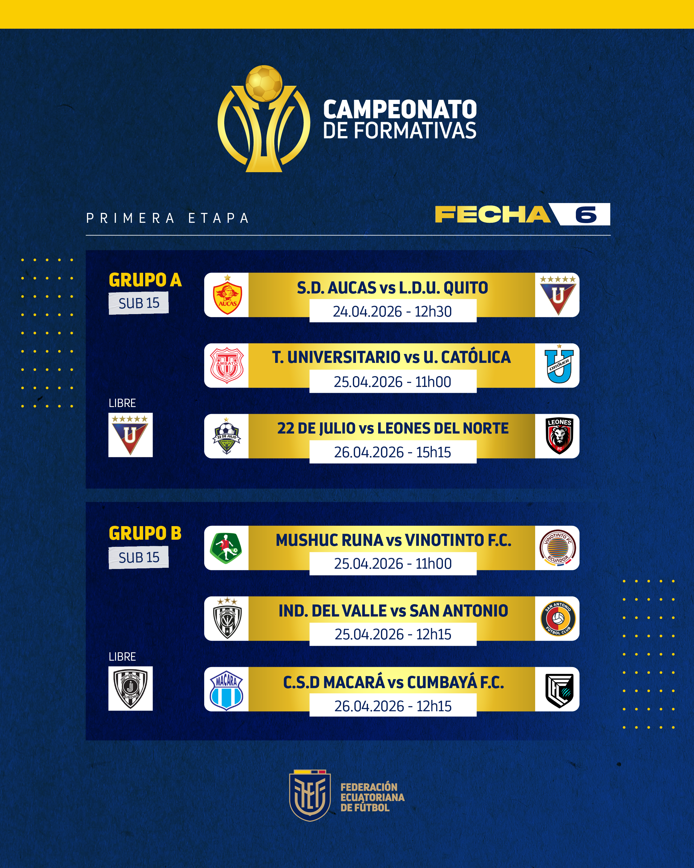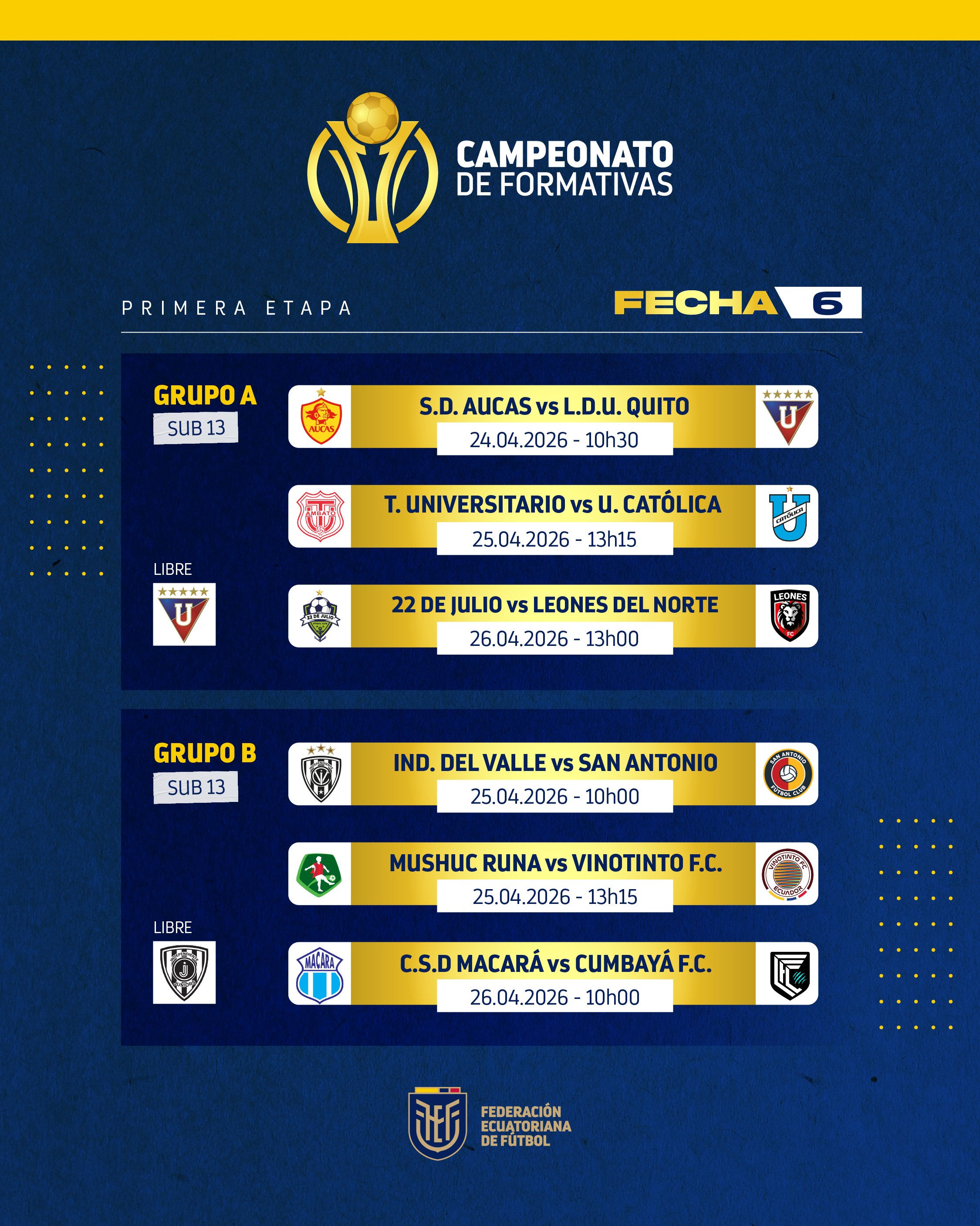 Martes 21 de abril de 2026.- El futuro del fútbol ecuatoriano se siembra cada día en todos los rincones de nuestro país, con el trabajo mancomunado de los clubes y el respaldo integral de la Federación Ecuatoriana de Fútbol (FEF) a los torneos oficiales infanto – juveniles que se realizan para brindarles competitividad.
